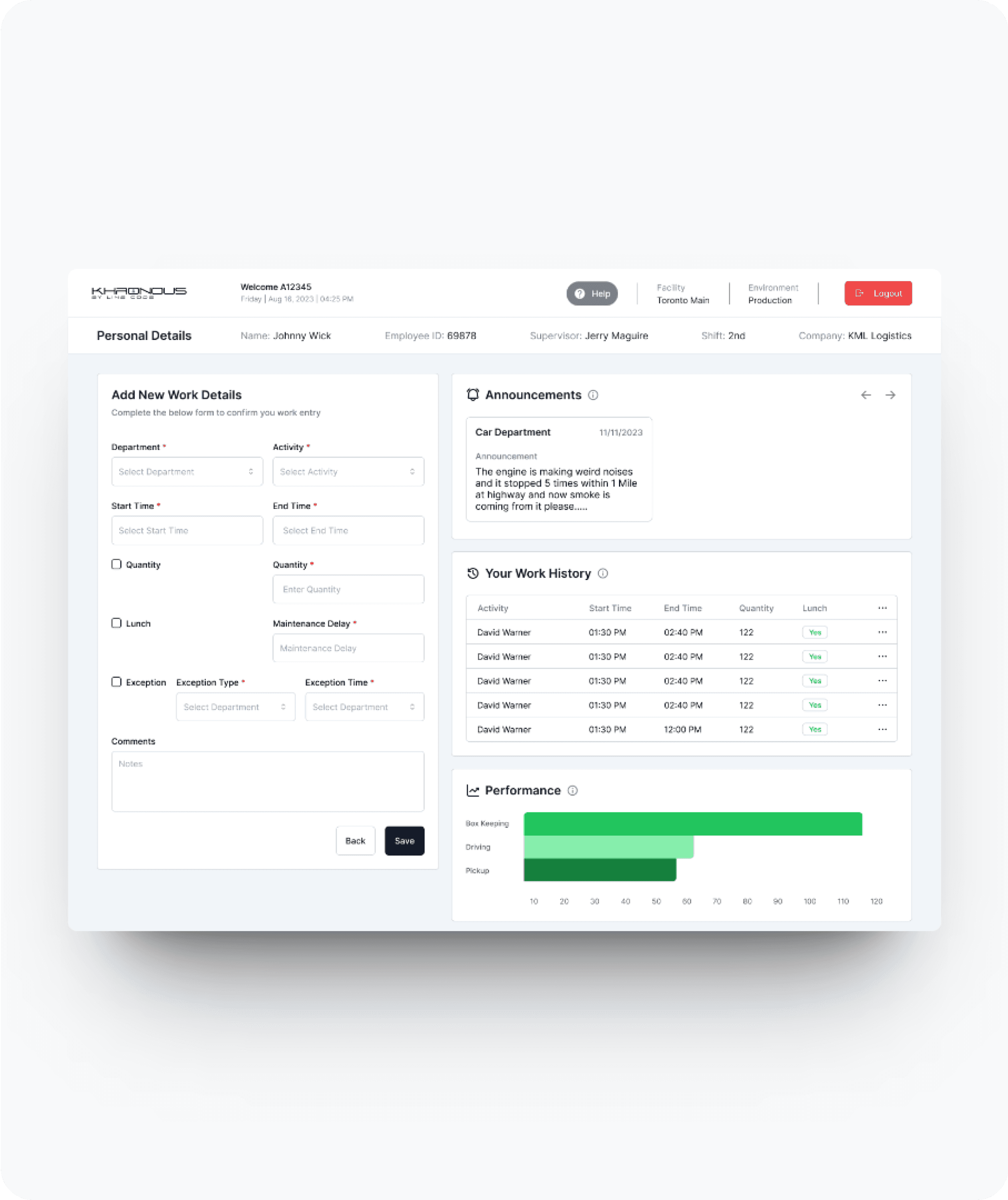Khronous's platform streamlines labour management by tracking timesheets, work activities, and performance targets, ensuring efficient monitoring of tasks and productivity.